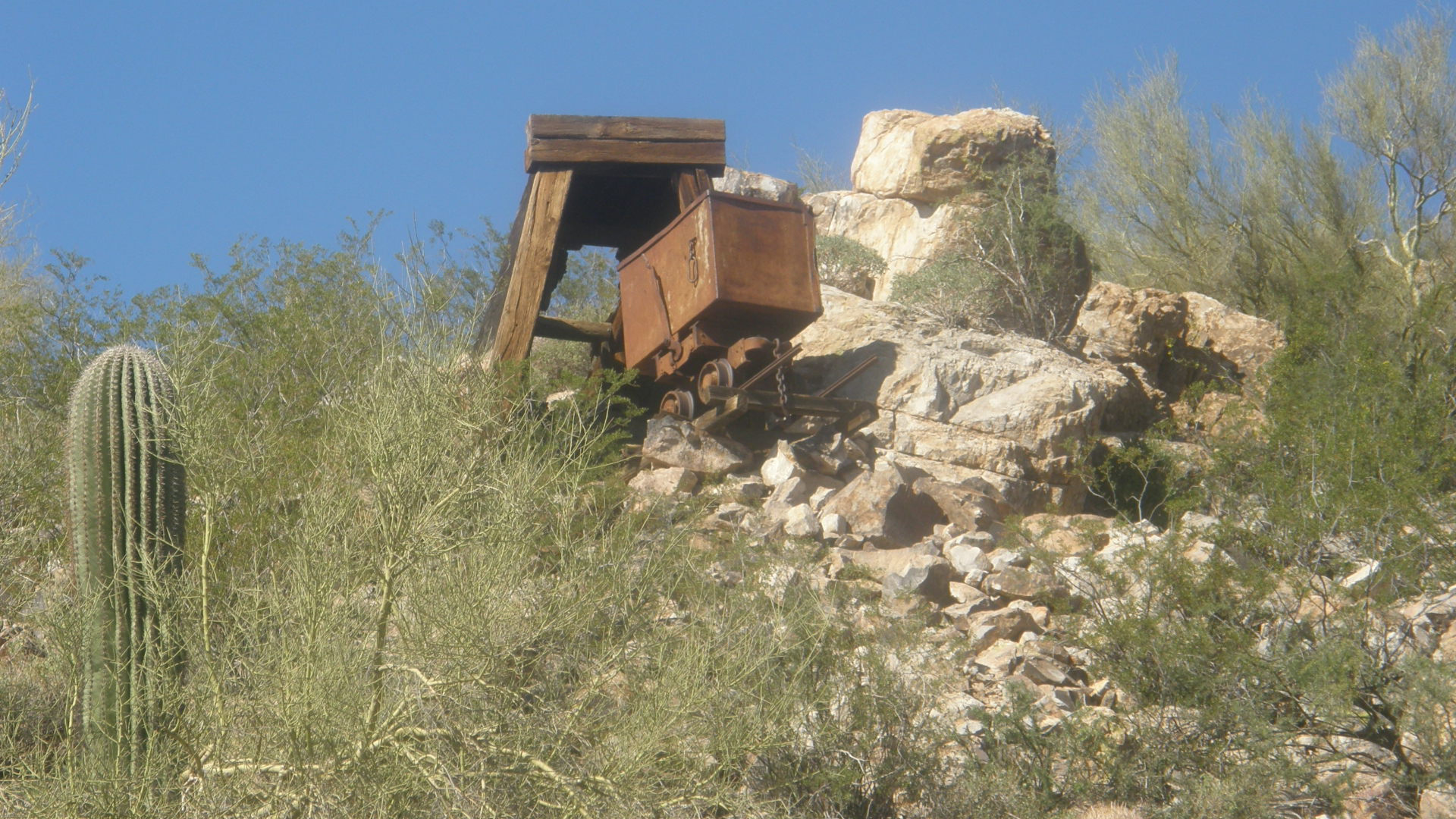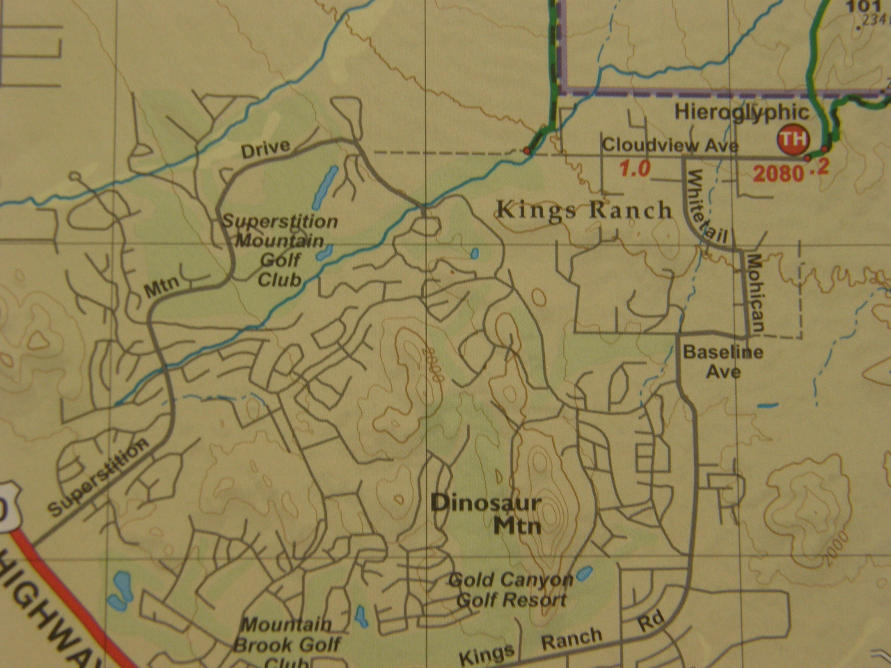 Someone, perhaps a local golf course, has placed some old mining equipment high on the ridge at the southern end of Dinosaur Mountain in a promiment location to be seen from King's Ranch Road. This may imply to passers-by that there may be valuable mineral deposits there. Unfortunately, there isn't anything valuable or unique about the rhyolites and dacites of which the ridge is composed. However, as far as I know, nearby on the eastern slope of the ridge is the only area within the boundaries of Gold Canyon that are conspicuously posted with a "No Trespassing" sign, which limits the ability to more fully explore the Dinosaur Mountain landform.