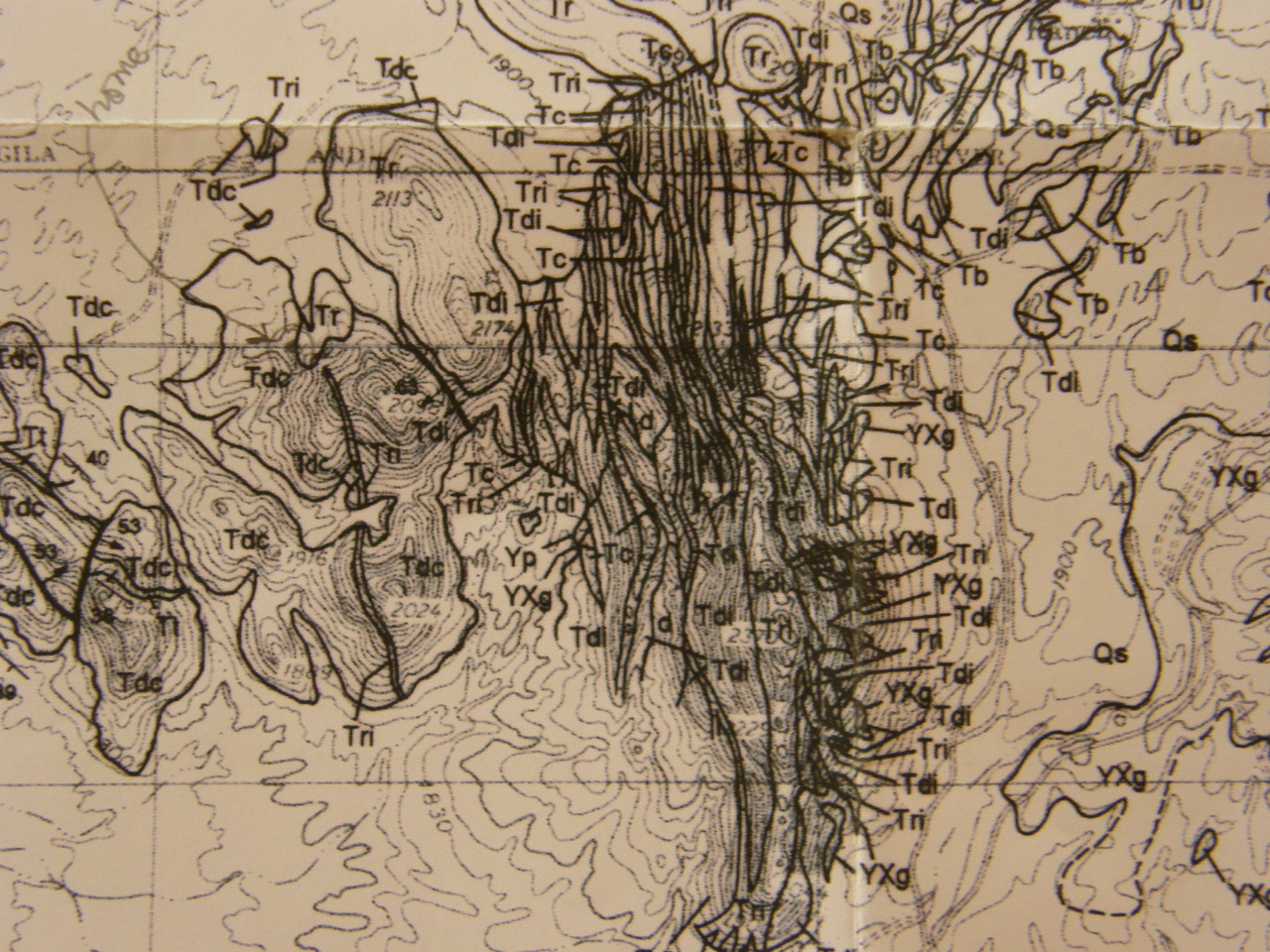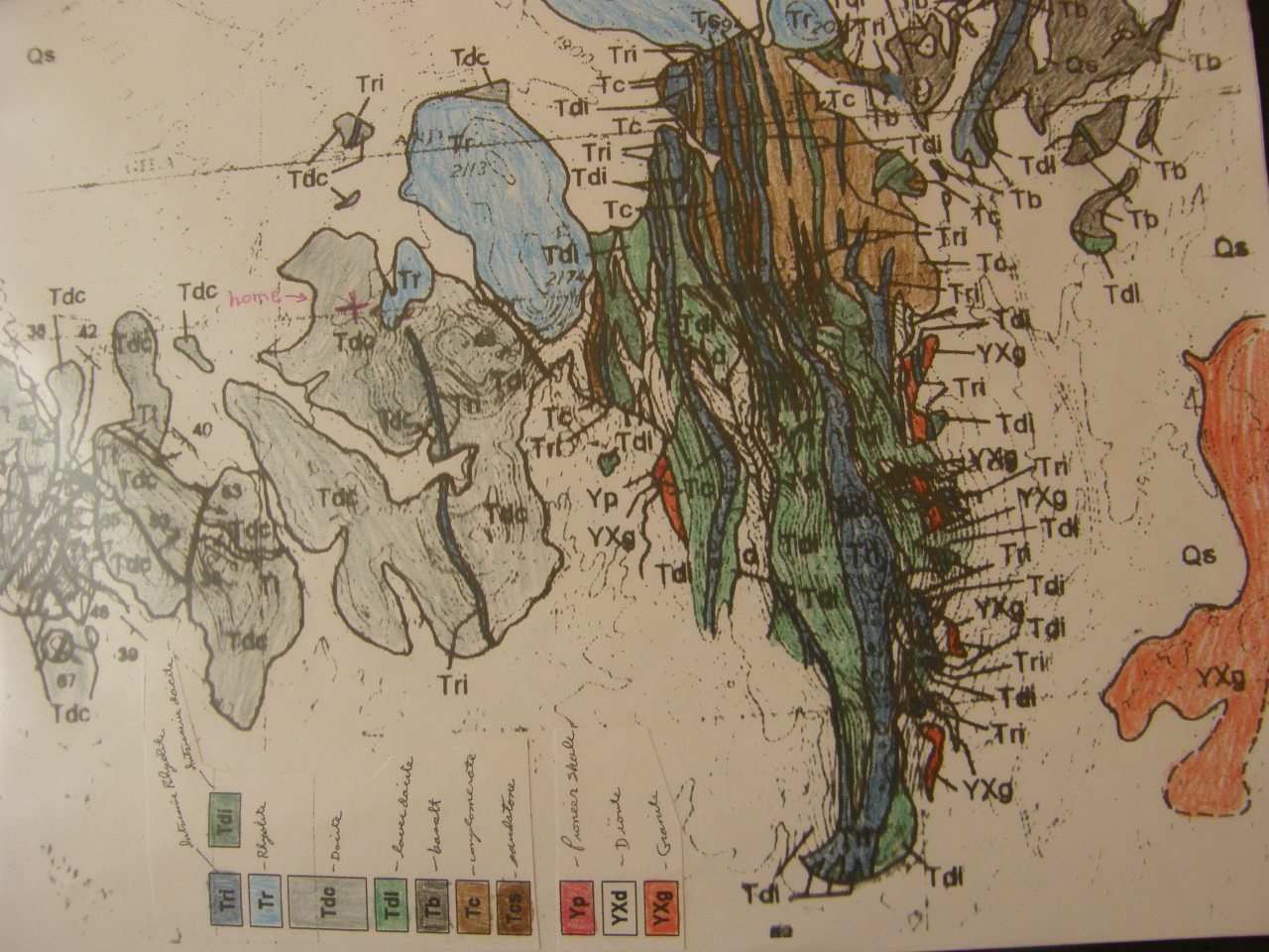 On the geologic map* below I have hand-colored the above geologic map* to make the geology easier to visualize, although the coloring makes it more difficult to read some of the individual symbols. The location of my home is indicated on this colored map with a red "+" sign. It is in the gray-colored "Tdc" rock unit: dacite which was dated at 29 million years where it is also exposed near Hieroglyphic Canyon.