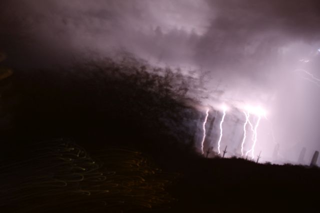 I purposely moved the camera while taking the lightning image above to show that what appears to the eye as a single sustained stroke is actually several individual strokes in rapid succession. The hand-held camera was moving from right to left when this sustained lightning stroke occurred.