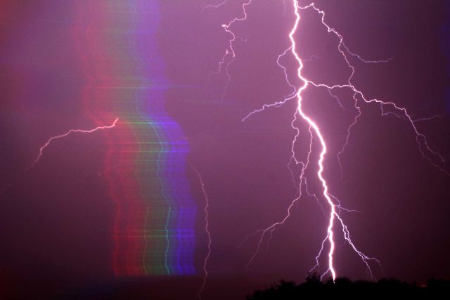 All the images that follow were taken through a regular telephoto lens without either diffraction gratings or prisms. They differ from "regular photography" only in that the camera was hand-held and in motion (I was holding the camera in front of me and swinging my upper body left-right, right-left, left-right, etc.) with the shutter open during a night-time lightning storm. All images were taken from my open garage in the front of my home, or my covered patio in the rear of my home.