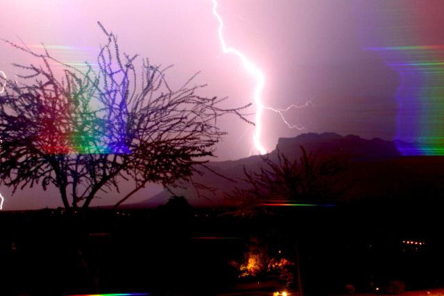 The photograph below shows a lightning stroke photographed through a transmission film diffraction grating. This stroke occurred on or beyond the far side of Superstition Mountain. The near edge of the mountain is located about 4 miles away from the camera. The lightning stroke is an unknown distance farther away than that.