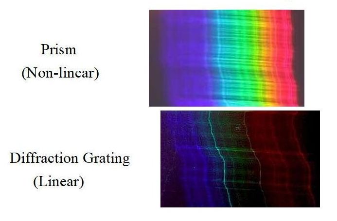 The image below shows a comparison of a scaled portion of the previous lightning spectrum (colors flipped horizontally) with a scaled portion of the first lightning spectrum on this web page. The upper spectrum on the image below was made with a prism and is non-linear in the wavelength (color) dimension along the bottom of the image, whereas the lower spectrum was made with a transmission diffraction grating and is linear in the wavelength dimension. Although the same emission lines appear on both spectra, they don't match throughout due to the differences between the linear and a non-linear representations. Relative to the linear representation, the non-linear expands the blue end and contracts the red end.
