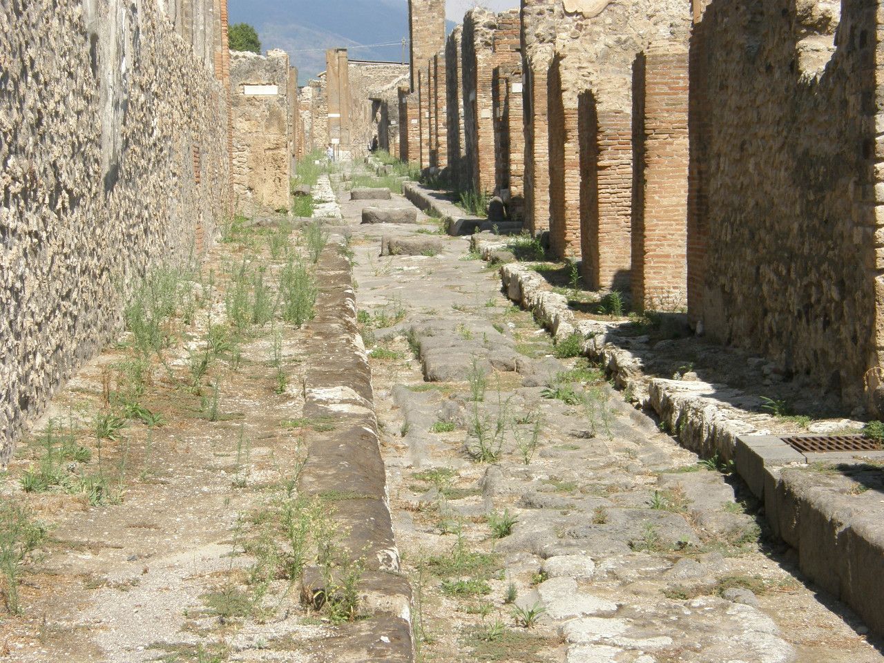 Pompeii was a thriving city nearer to the ocean than it is today due to the land added by the AD 79 eruption. Previous eruptions created deposits that made for a very fertile surrounding farmland. Thus, Pompeii was a city with integrated functions and a populace that spanned the range of very wealthy to poor and, even poorer, a large slave population. The city streets, as can be see in the following two images (below), show stone-floored streets with walkways on both sides. Horses pulled carts on the streets, the wheels of which wore grooves into the stone base. It is not hard to imagine that there was probably abundant horse manure that accumulated in the lower streets between the higher walkways on each side. Thus, there are periodic stone steps to walk from one side of the street to the other without necessarily getting your feet messy in the process. The spacing between these stepping stones determined the spacing of the wagon wheels and carriage wheels.
